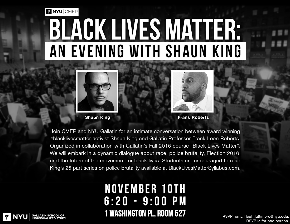 Award winning activist Shaun King joined our NYU seminar on Black Lives Matter for an intimate dialogue about Election 2016, and the future of the movement for black lives. Co-sponsored by Leah Lattimore with the NYU Center for Multicultural Education and Programming.